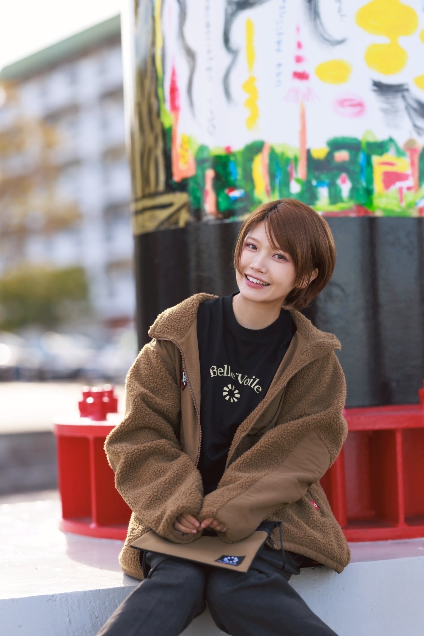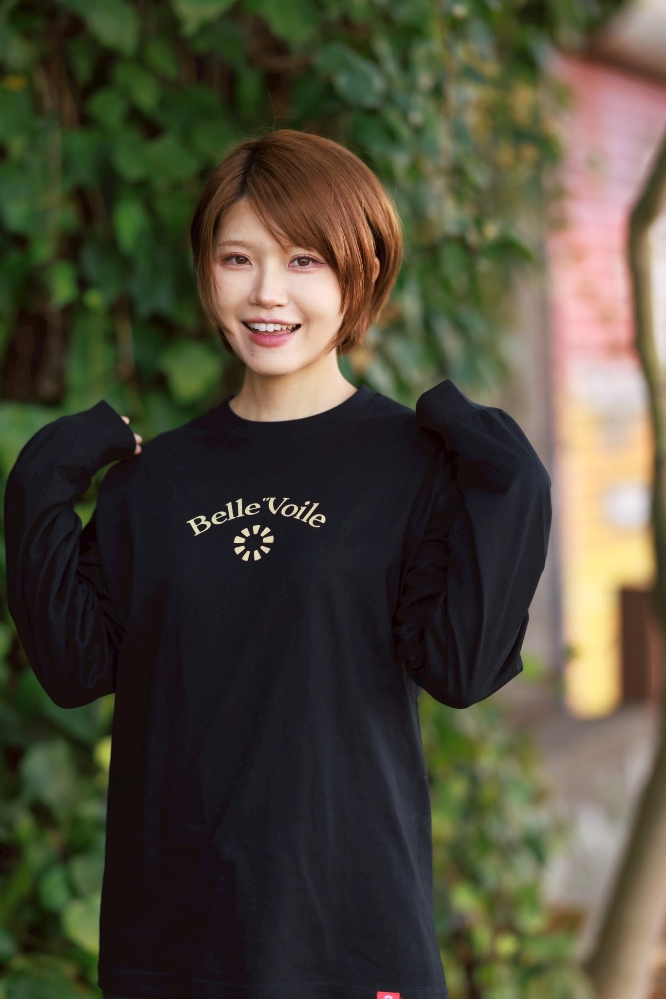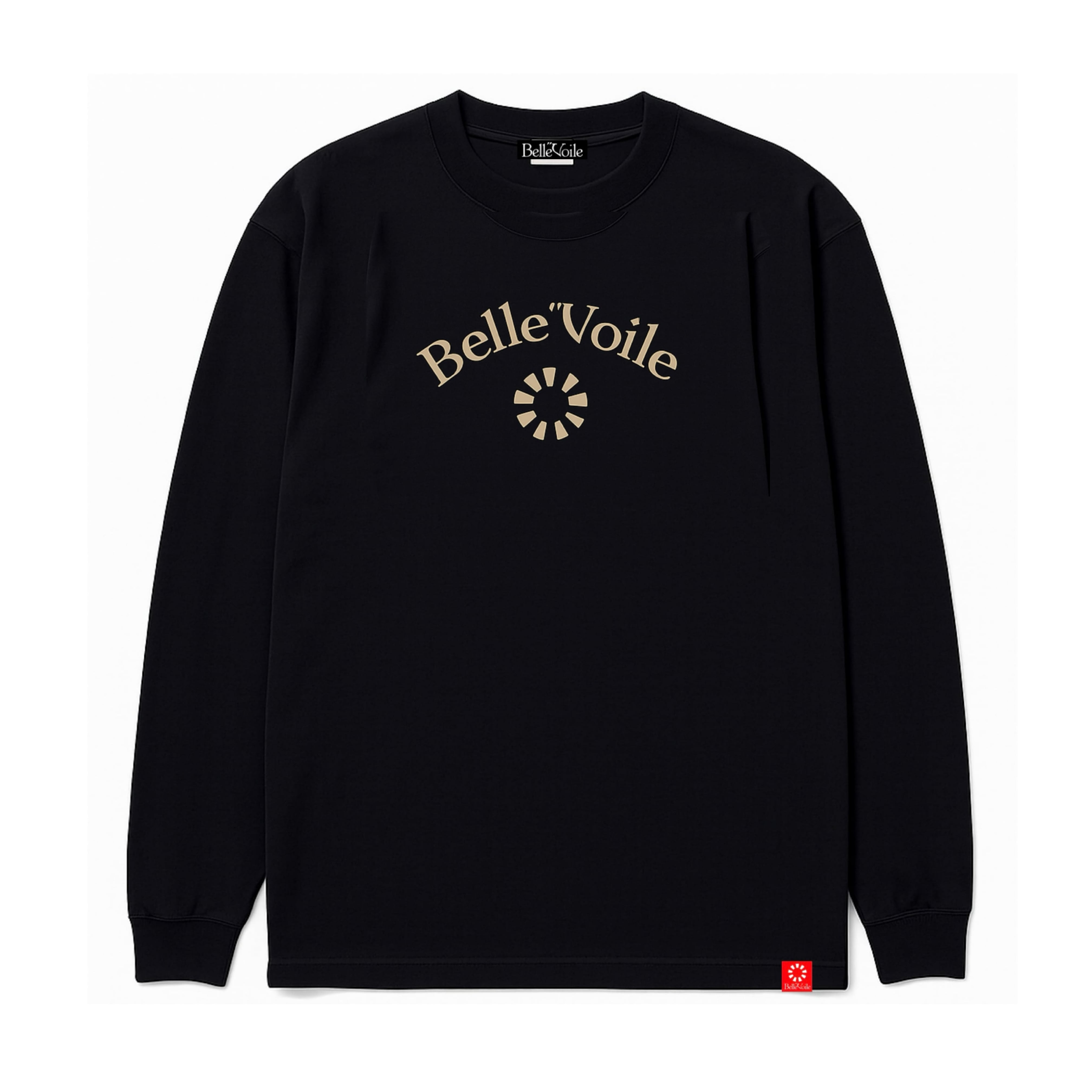 秋冬のアウターにも馴染み、季節感のあるトーンで魅せる1枚です。胸元には、Belle”Voileの象徴的なアーチロゴをレトロ風にして、放射エンブレムをプリントしました。