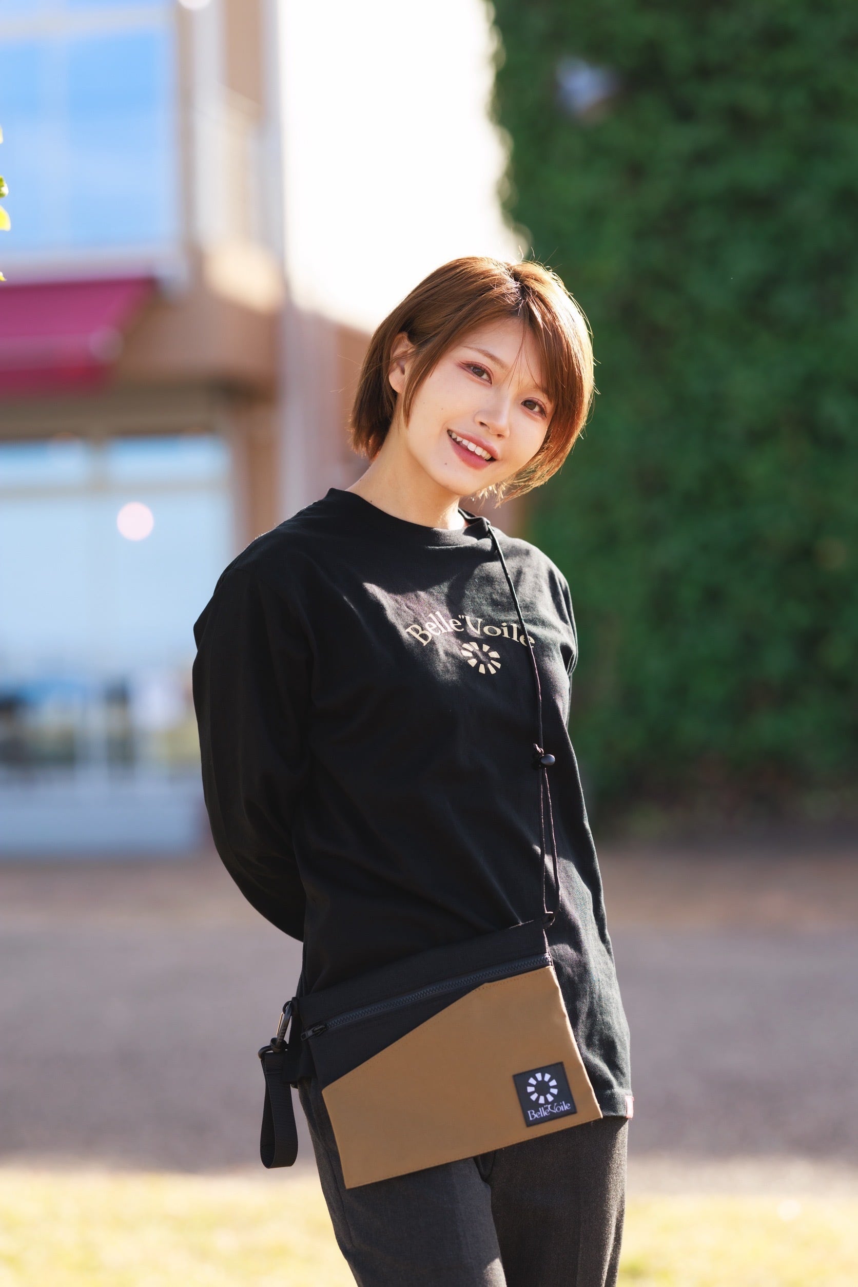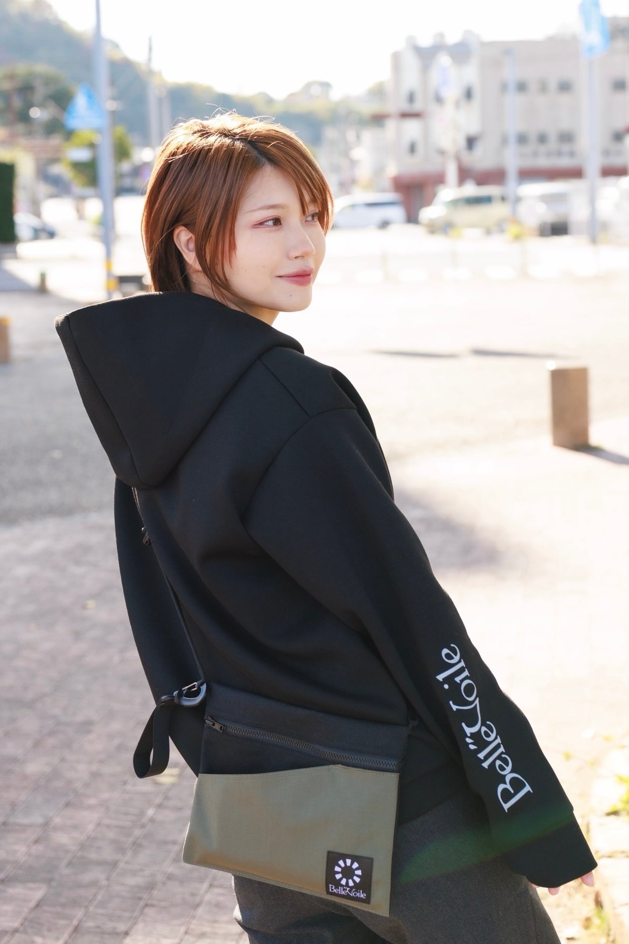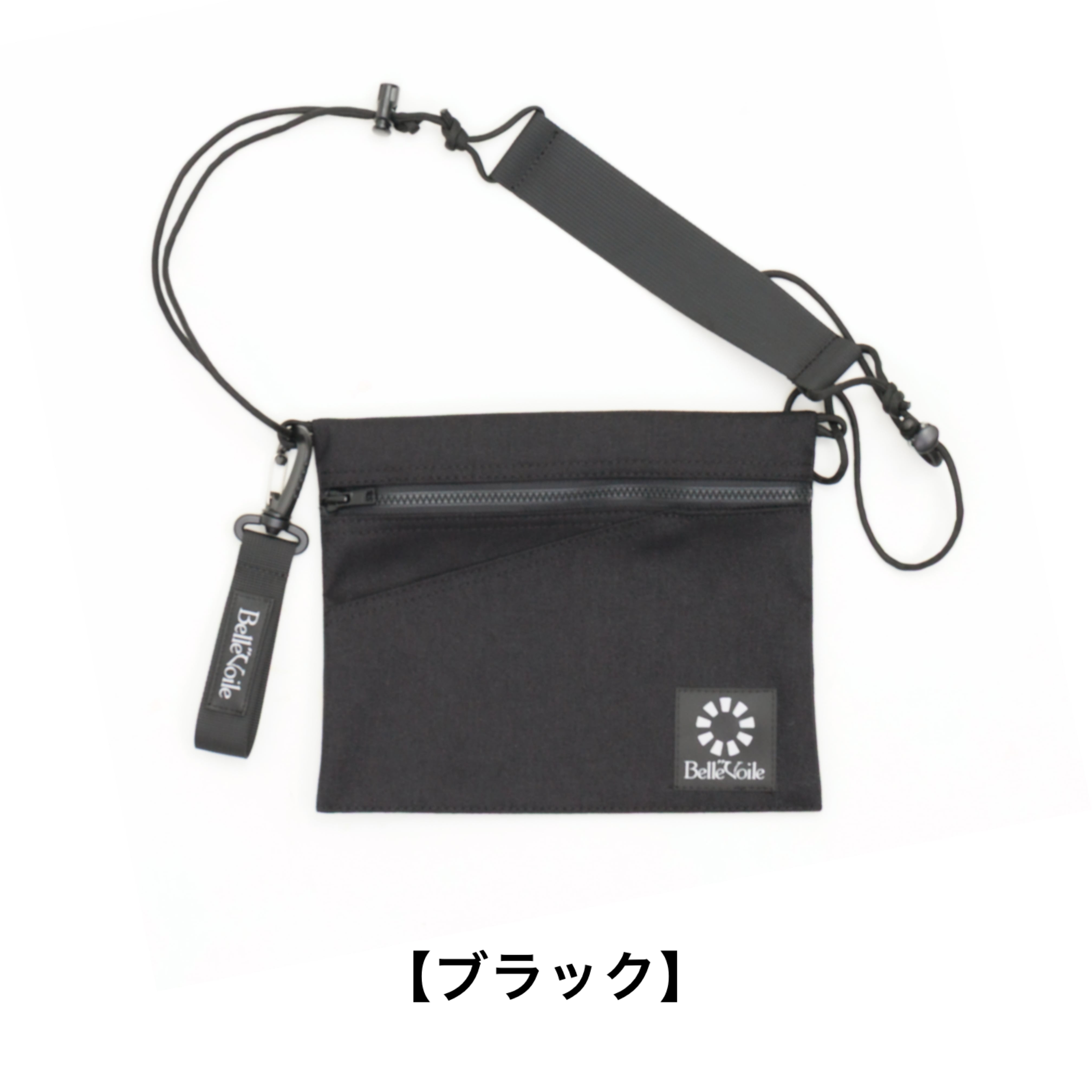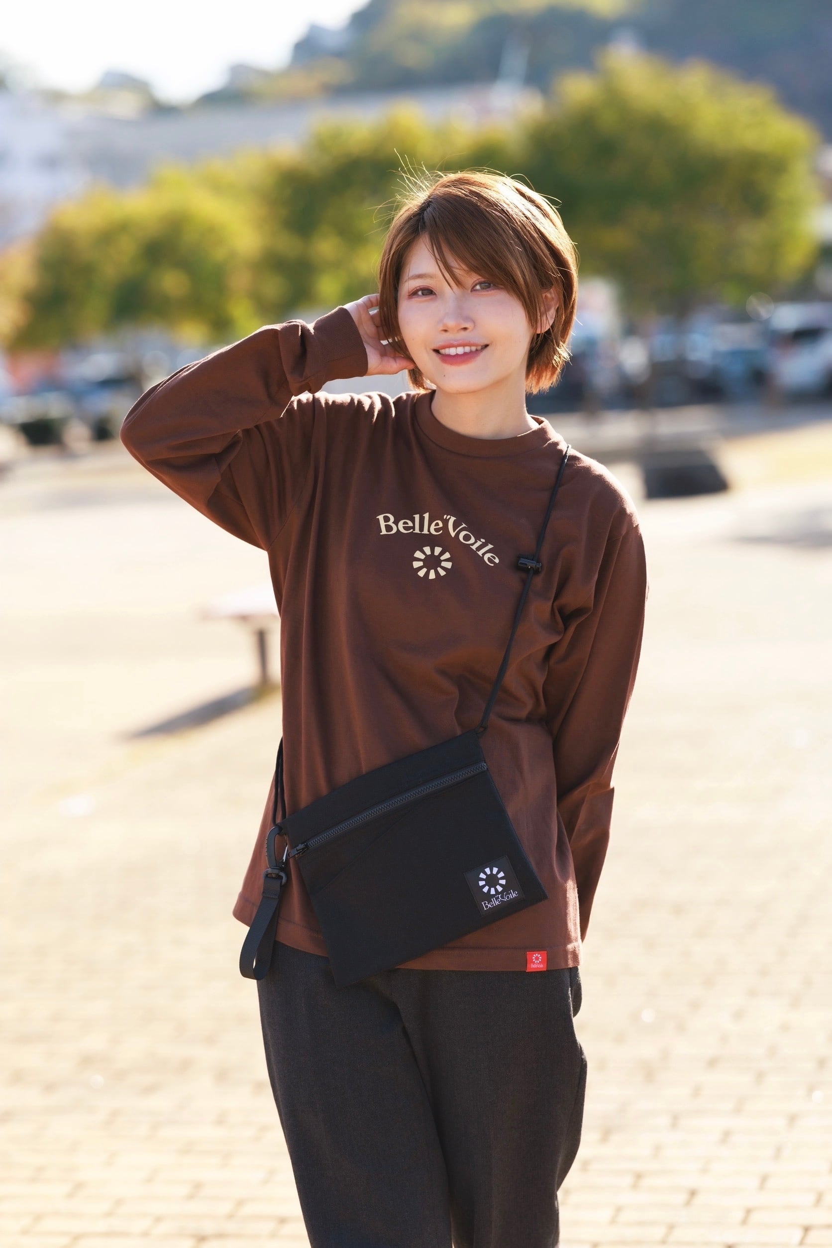 紐で長さの調節ができ、取り外し可能なBelle”Voileのオリジナルストラップが付いています。フロントはポケットになっているので、すぐに取り出したいスマホや小物などを入れるのにオススメ。